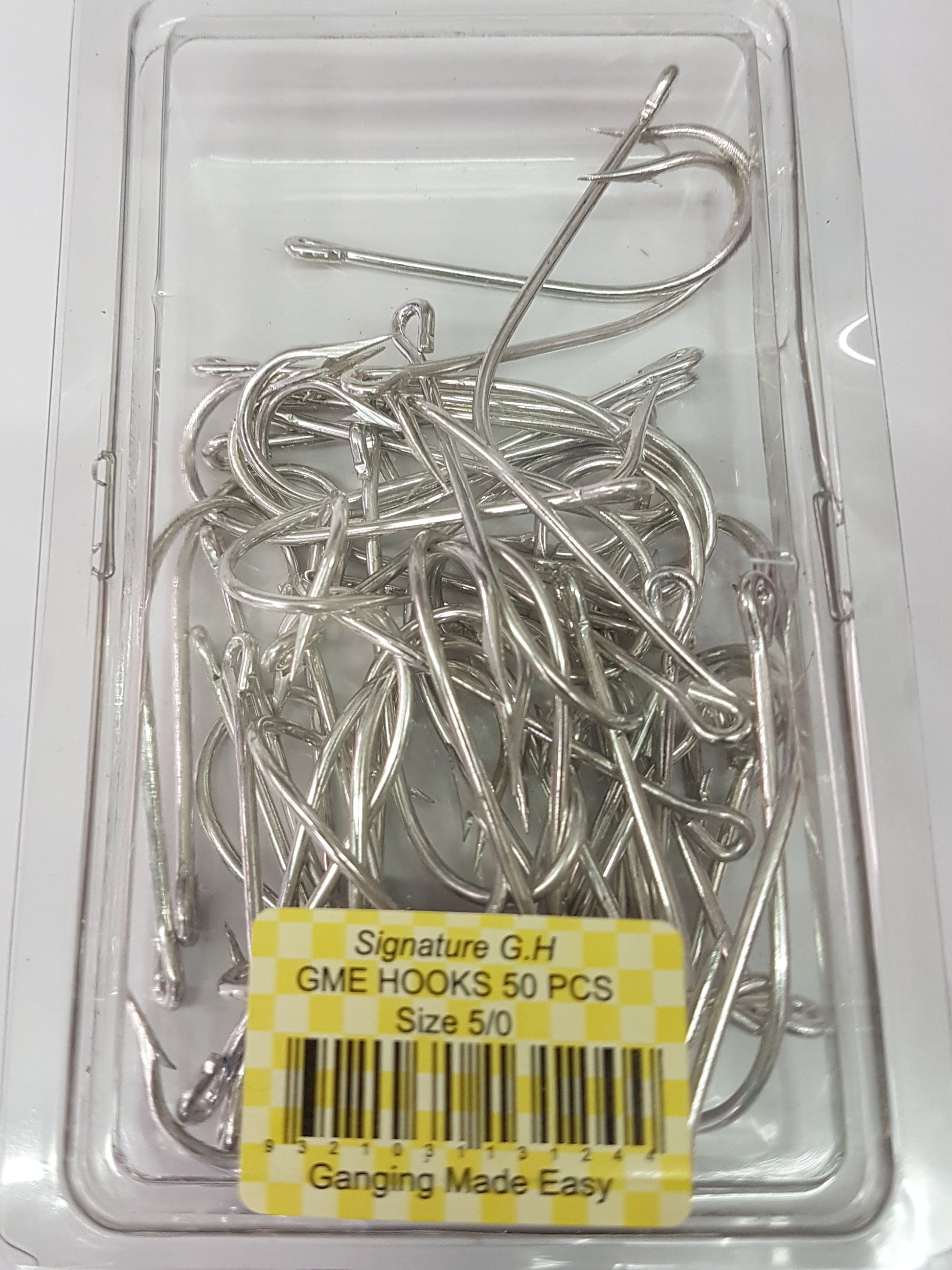 GME hooks are designed with a teardrop eye so that hooks can be ganged together without the use of pliers.