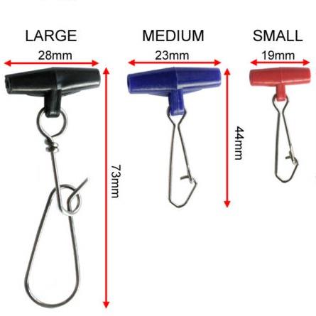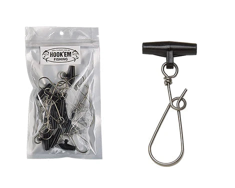 Hookem Large running sinker clips are a must when using running sinker rigs with big sinkers. The Large clip allows the user to attach heavy snapper style sinkers up to 32oz when bottom fishing deep water. A must have for every angler.